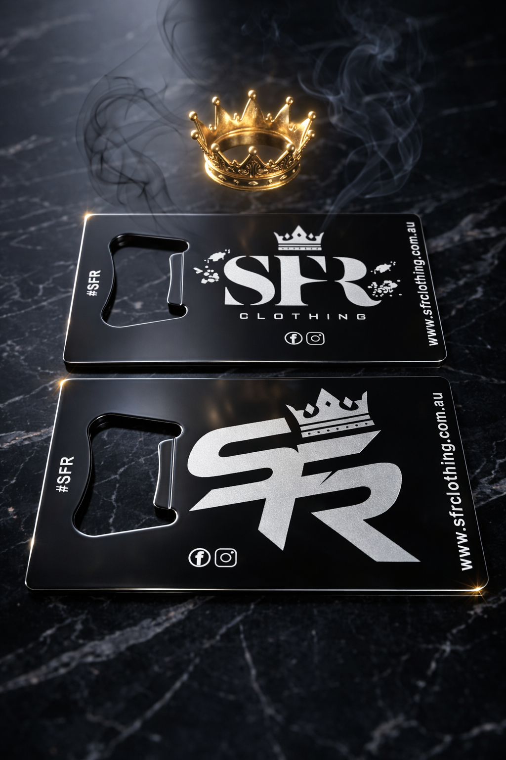 Secure the ultimate everyday carry. This slim, high quality bottle opener is precision-cut from heavy-duty steel to slide perfectly into your wallet or pocket. Featuring a double-sided sleek matte finish and the signature SFR crown on one side, and our secondary SFR crown on the other side, it is a durable tool built to last.