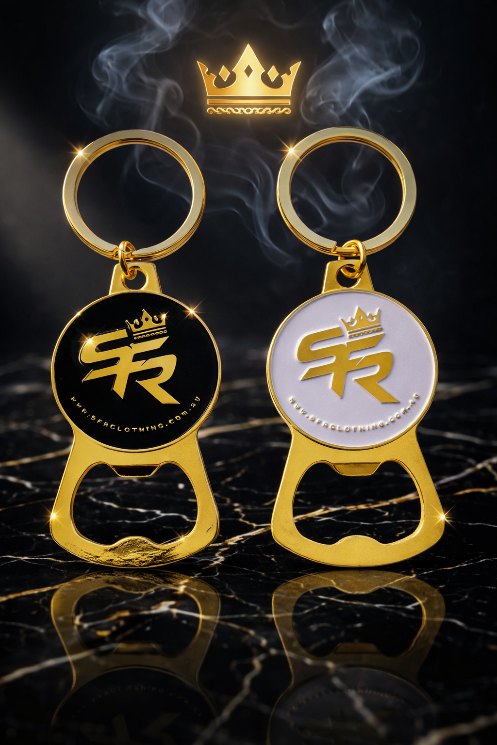 Level up your essentials with our high quality dual-tone keyring. This standout piece features a bold black and gold face paired with a clean white and gold flip side for a versatile, premium look. Built with a robust frame and high-shine finish, it delivers long-term durability while repping the iconic SFR monogram.